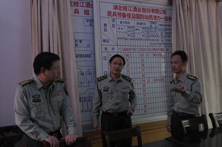 5月8日,宜昌軍分區(qū)司令員孟春林一行在枝江市人武部部長胡文雄、政委鄧正平等人的陪同下到枝江酒業(yè)檢查指導(dǎo)民兵組織整頓工作,基層組織建設(shè)工作。枝江酒業(yè)黨委書記張華、副總經(jīng)理劉前生對來訪領(lǐng)導(dǎo)給予了熱情接待,并陪同參觀了枝江酒業(yè)展廳、包裝車間、釀造車間。